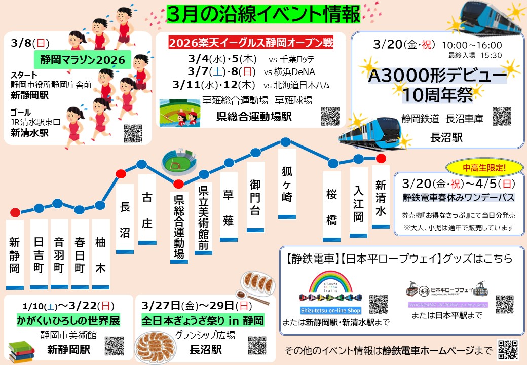 | 静鉄電車春休みワンデーパス | 開催日:3/20~4/5 | 最寄り駅:新静岡 | 外部サイトへ |