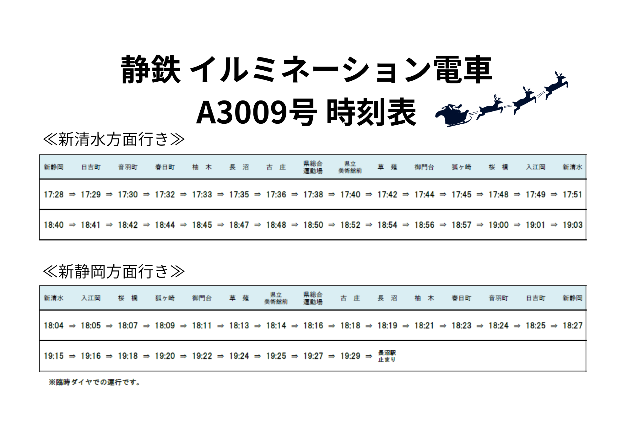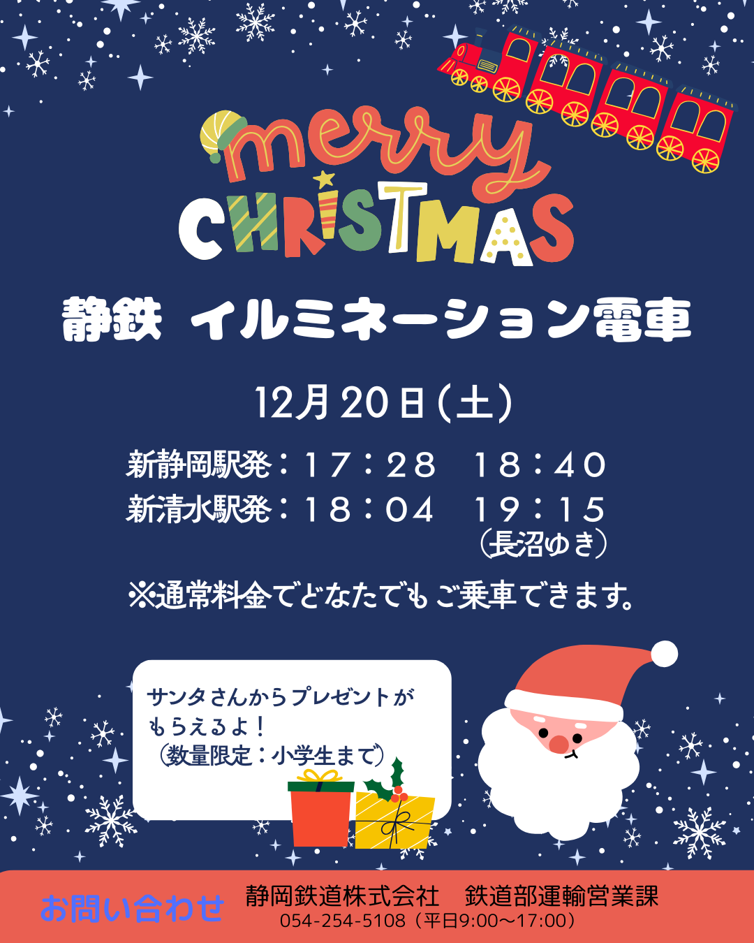| 内 容 | ・イルミネーション電車(特別臨時列車) 通常料金でどなたでもご乗車可能 小学生以下のお子さまにプチギフトのプレゼント(数量限定) (新静岡駅発) ①17:28(新清水行き) ②18:40(新清水行き) (新清水駅発) ①18:04(新静岡行き) ②19:15(長沼行き) ※行先表示器:クリスマスバージョンは12月1日~実施中 |