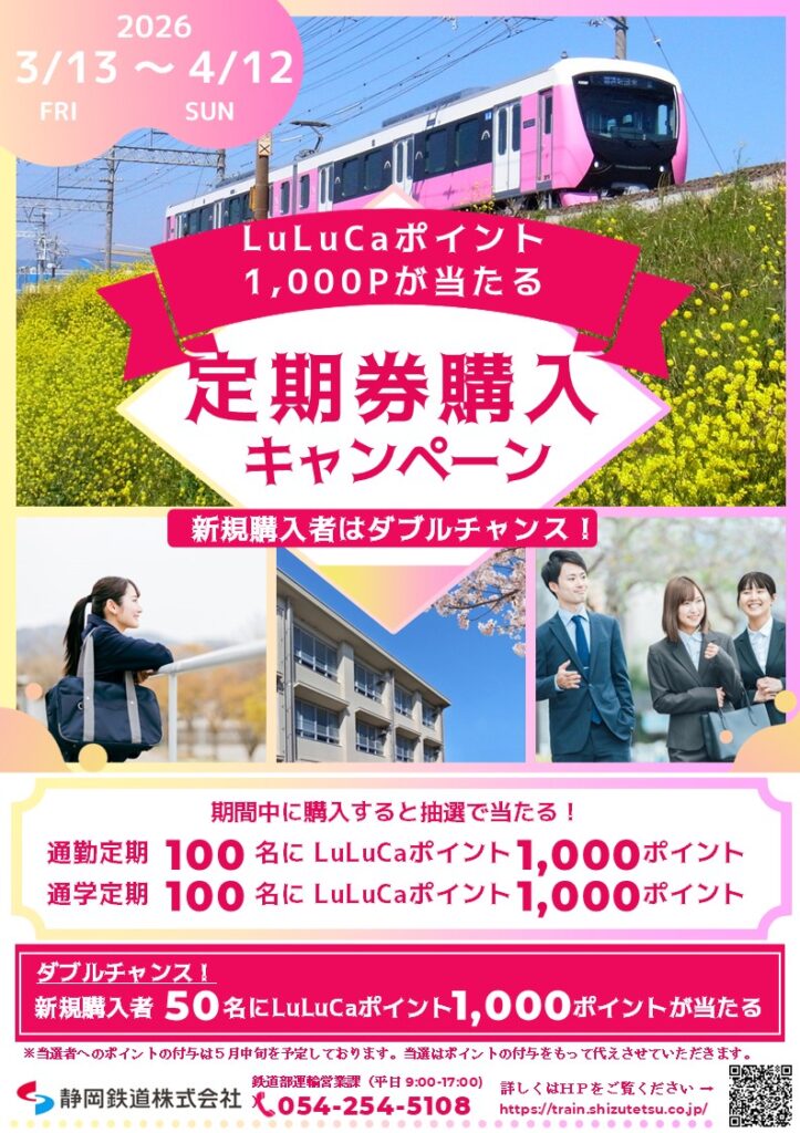 ・期間中に「静鉄電車」の区間を含む定期券を購入すると自動的に対象となります。