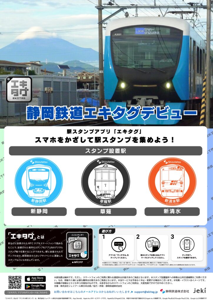 デジタル駅スタンプ「エキタグ」の設置駅は新静岡・草薙・新清水の3駅です。スタンプのデザインはA3000形・1000形・デワ車両を採用し、静岡鉄道の車両の特徴や歴史を感じていただけるデザインとなっております。